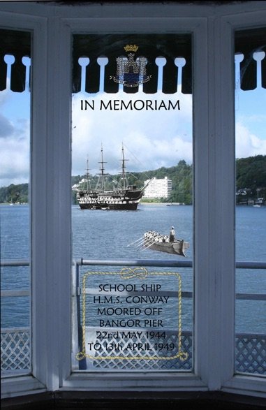 The ship was moored at Glyn Garth off Bangor Pier from 22nd May 1941, moving there to avoid the bombing of  Merseyside which had come close to sinking her. She remained at Glyn Garth until 13th April 1949 when she moved to Plas Newydd. Bangor Town Council (who own the pier) agreed to the installation of a memorial window in the seating kiosk at the end of the pier that overlooks the ship’s old mooring. An “opening/dedication” ceremony’s held at 1130hrs on Saturday 13th May 2017 – 76 years almost to the day that the ship passed the end of the pier en route to her new mooring. There was a parade of local Sea Cadet units led by the band and cadets of TS Conway and A buffet lunch in the University afterwards.