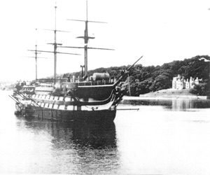 The window is based on the Conlan Ship Window in the chapel in that it has an engraved image of the ship being approached by a cutter showing the ship at her old mooring. The window is based on the photos below.