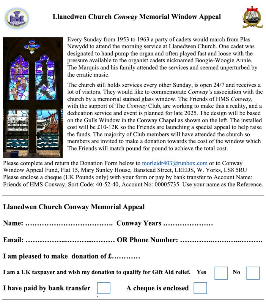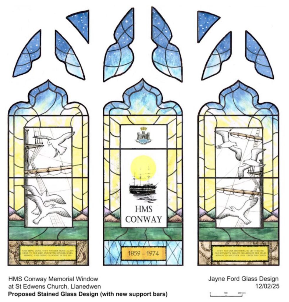 The Friends’ Trustees chose Jayne Ford Glass & Design to produce the window as she did such a splendid job on the Bangor Pier and PN Dock memorial windows. The church window is likely to cost £10K to £12K to make plus installation costs so the Trustees and the Conway Club Committee agreed to launch an appeal to OCs to help fund the project. The following article appeared in the February 2025 issue of The Cadet magazine. Donations have started to flow in but please do consider making a donation so this important memorial can become a reality.
