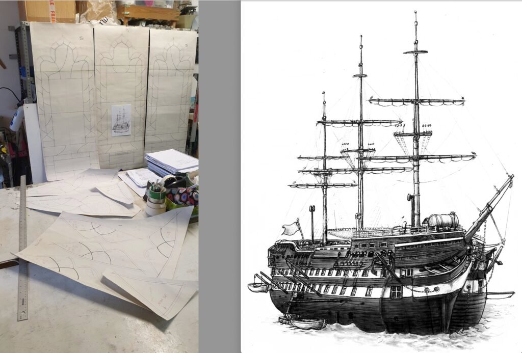 The image above right is of the ship for the window’s centre panel. It’s incredibly clever how she takes several photos of the ship, none at quite the right angle, and then manipulates them into the viewpoint she wantsThe image above left is Jayne’s working mock up – the actual panels will be much larger than shown.