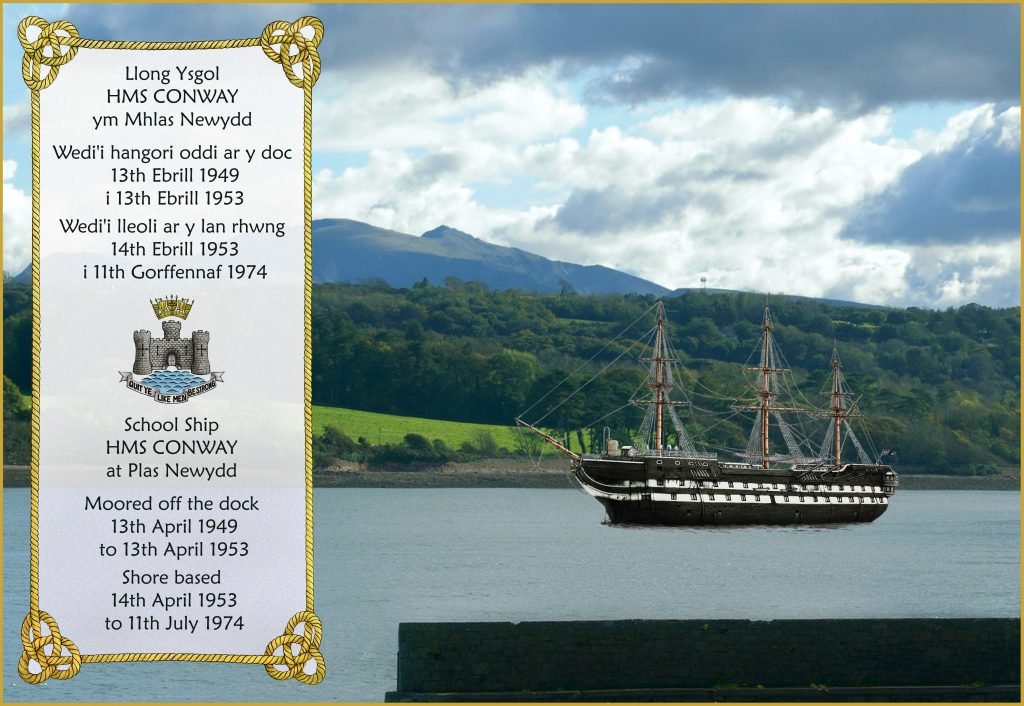 In 2018 the National Trust very kindly agreed to the installation of a Conway memorial window to commemorate the ship’s time at Plas Newydd and of the cadets who trained there. Located at the dock, it is identical in concept to the Bangor Pier Memorial Window and the Conlan Memorial Window at Rock Ferry giving the impression that the ship is still on her old mooring. The memorial was unveiled and dedicated in October 2021.