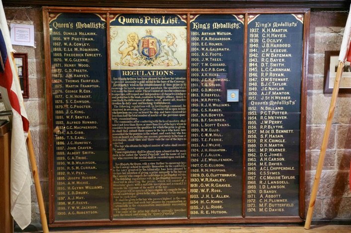 The King’s / Queen’s Gold Medal was awarded every year from 1865 to 1974 and the board was created to record the names of the winners.