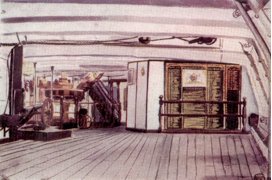Originally it was in the ship on the port side of the Orlop Deck facing aft. The painting on the right shows it there in 1953. It is now in the chapel.