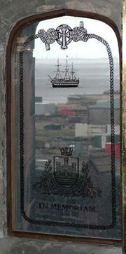 One window in the chapel overlooks the Ship’s old mooring in the Sloyne off Rock Ferry pier. It has been engraved very cleverly with an image of the ship which, when viewed from the correct angle, gives the impression that she is still on her mooring.