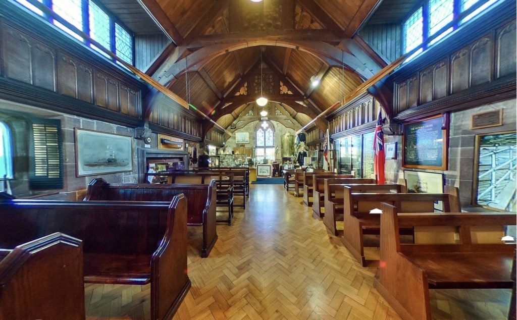 The reverse view from the altar back to the entrance door also shows the wonderful roof timbers and windows. The“Gulls” window faces the altar and was the first window installed in the chapel. Mounted on the wall either side of the window are the brass World War I Memorial Board and a wooden World War II Memorial Board.